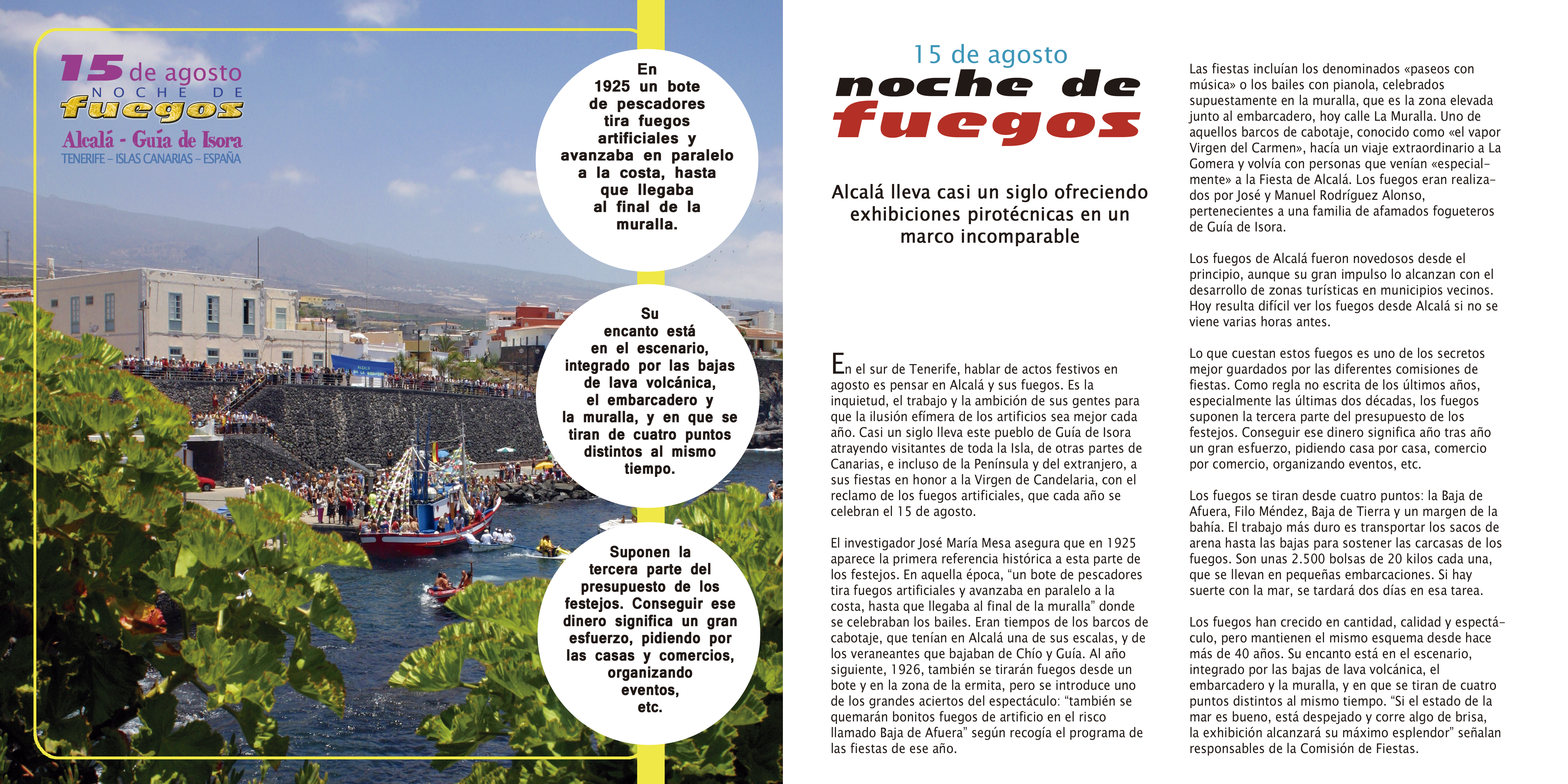 Una exhibición de luz, color y sonido que lleva celebrándose desde hace casi un siglo y que se ha convertido en una de las más espectaculares de Tenerife “y probablemente también de Canarias”, según reconocen los responsables de la pirotecnia ‘Hermanos Toste’ que lleva poniendo los fuegos de Alcalá durante unos 80 años, de forma casi ininterrumpida.