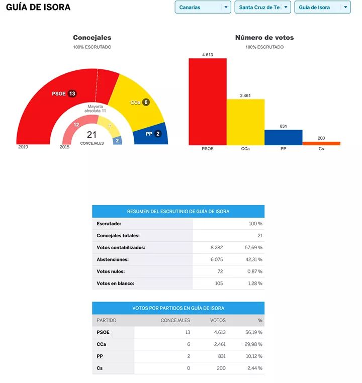 La población isorana ejerció su derecho el pasado domingo registrando 8.282 votos. La mayoría absoluta fue para el PSOE obteniendo 13 concejales, 6 Coalición Canaria y 2 el Partido Popular.