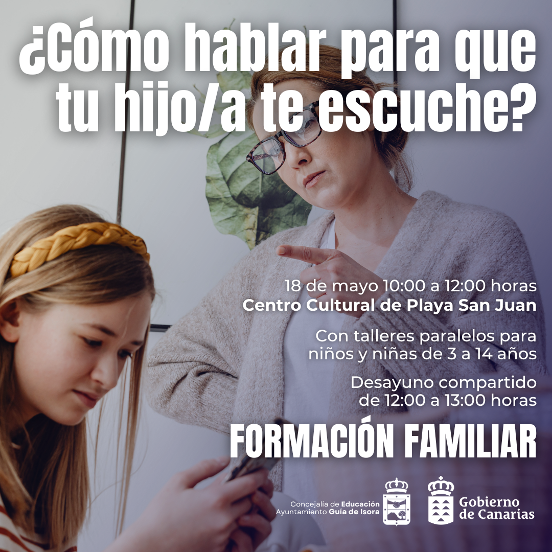 El Ayuntamiento de Guía de Isora, a través de la concejalía de Educación que dirige Victoria Cruz, organiza el taller ‘¿Cómo hablar para que tu hijo/a te escuche?’ dentro de la formación familiar que lleva a cabo el municipio. Un taller que cuenta con la colaboración del Gobierno de Canarias a través del Área de Servicios Sociales, Igualdad, Diversidad y Juventud.