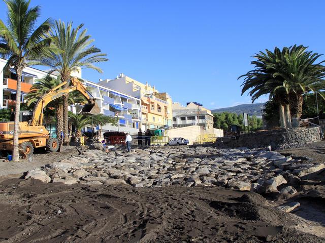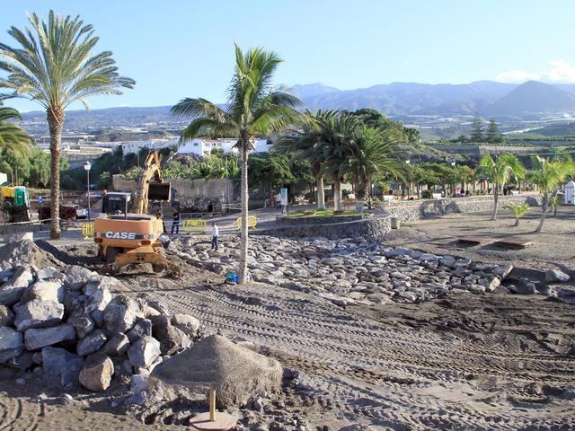 El último temporal de lluvias provocó nuevamente daños en la zona de baño de Playa San Juan. Para reparar esos desperfectos y minimizar en un futuro los daños provocados por las aguas de escorrentía en la zona de baño de Playa San Juan, el Ayuntamiento de Guía de Isora, con el visto bueno de la Demarcación Provincial de Costas de Santa Cruz de Tenerife, está llevando a cabo unas obras consistentes en la colocación de una base de piedra de gran tamaño en la desembocadura del barranco, lugar donde más daños provocan las corrientes de agua y sedimentos cuando se producen fuertes lluvias.