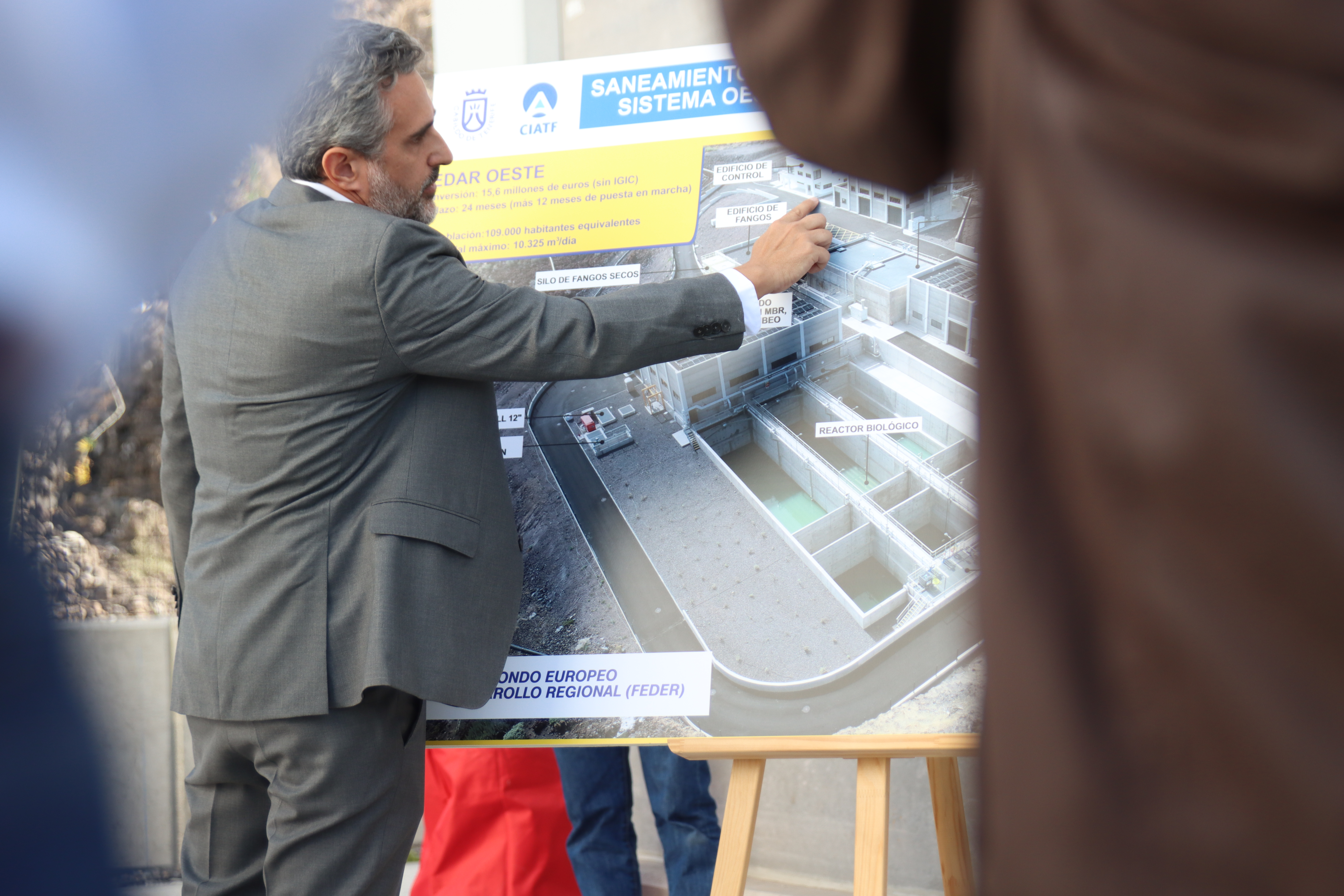 Los asistentes han podido comprobar in situ el estado de la EDAR de Oeste, ubicada en el término municipal de Guía de Isora, que tratará las aguas residuales de hasta 109.000 habitantes equivalentes de este municipio y las de Santiago del Teide, con un caudal máximo de 12.000 m3/día, de los que dos terceras partes son bombeados desde la zona de costa (Puerto de los Gigantes, Puerto de Santiago, Punta Blanca, Alcalá y San Juan) a través de la Estación de Tratamiento y Bombeo (ETBAR) de San Juan Comarcal. La inversión de este sistema alcanza los 35 millones de euros.