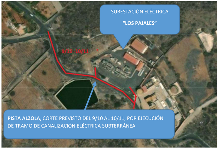 A modo informativo se adjunta imagen de la Subestación Eléctrica de los Pajales y el corte de la carretera con frente a la misma, previsto entre los días 9 de octubre y 10 de noviembre del presente.
