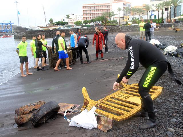 Con la ayuda de una docena de submarinistas, una lancha, varios vehículos de los bomberos y otros equipamientos, durante la jornada se sacaron del fondo marino diversos objetos, entre los que destacaron algunos de gran tamaño como neumáticos, una valla de plástico y un contenedor de basura que en su momento fueron arrastrados al mar durante el temporal de lluvias de febrero de 2010.