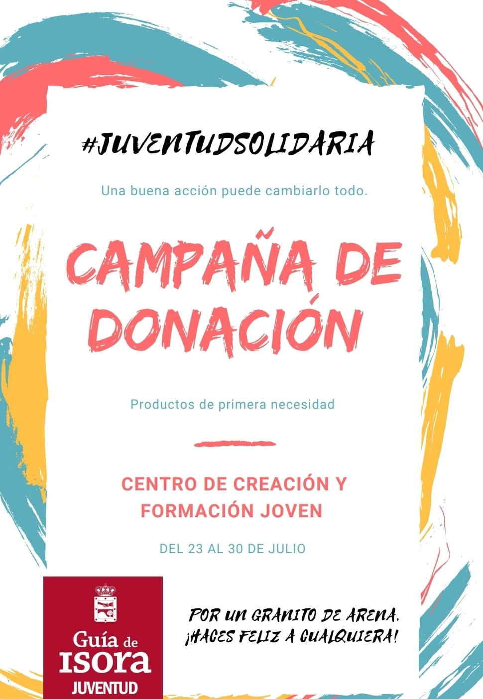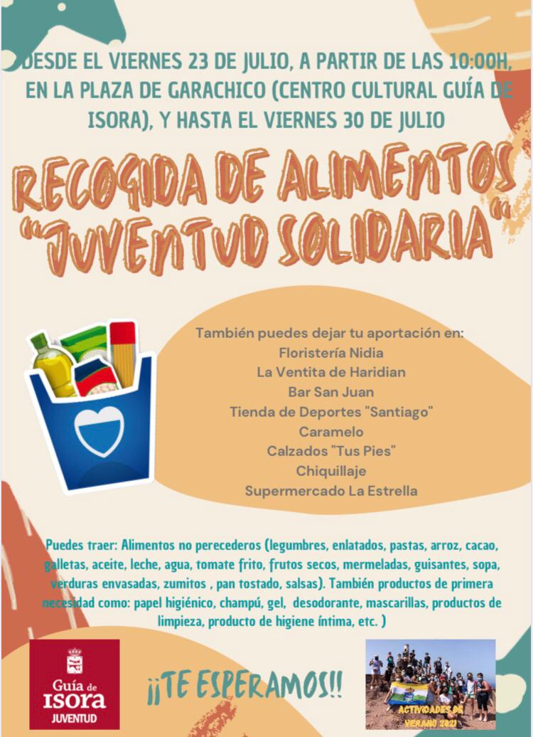 Para ello, han organizado una recogida solidaria de alimentos no perecederos y productos de primera necesidad. Montarán un stand de recogida en la plaza de Garachico, junto a la Casa de la Juventud de Guía casco y en el Centro de Creación y Formación Joven de Playa de San Juan hasta el 30 de julio. También se han puesto de acuerdo con comercios isoranos a través de los cuales las personas interesadas podrán hacer llegar sus donaciones. Los comercios son: floristería Nidia; La Ventita de Haridian; el Bar San Juan; Deportes Santiago; Caramelo; Calzados Tus Pies; Chiquillaje y Supermercado La Estrella.