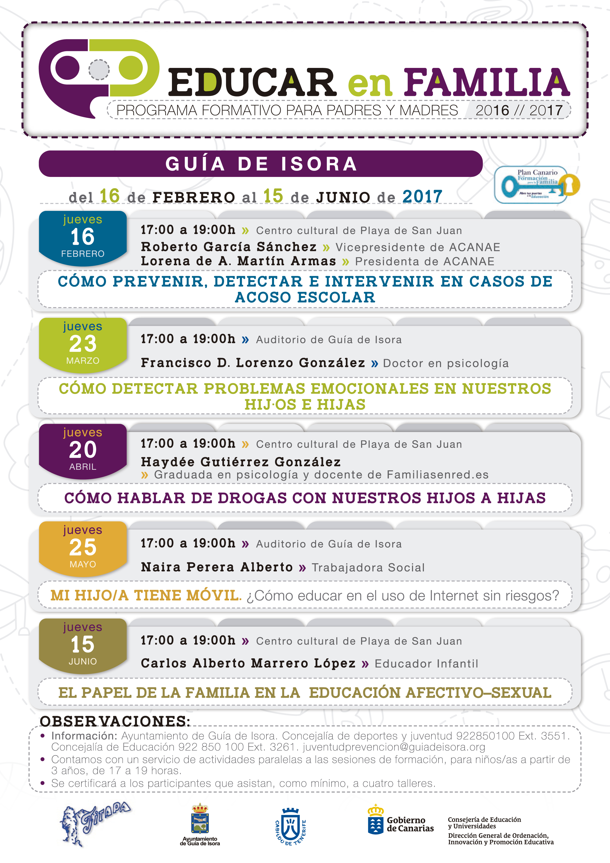 Cómo hablar sobre drogas con nuestros hijos e hijas, el papel de la familia en la educación afectivo sexual o el acoso escolar son algunos de los temas que protagonizarán las sesiones del programa formativo ‘Educar en Familia’, organizado por el Ayuntamiento de Guía de Isora, en colaboración con la Consejería de Educación del Gobierno de Canarias; el Cabildo de Tenerife y FITAPA.