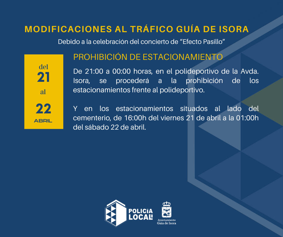 Debido a la celebración del concierto de ‘Efecto Pasillo’, estará prohibido estacionar el viernes 21 desde las 21:00 a las 00:00 horas en el polideportivo de la Avda. Isora. Se procederá a la prohibición de los estacionamientos frente al polideportivo.