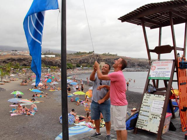 Por segundo año consecutivo, la bahía de Playa San Juan, en Guía de Isora, obtuvo la concesión de la Bandera Azul, galardón que se concede anualmente y que tiene como objetivo reconocer la excelente calidad de agua y zona de baño de las playas. El izado oficial que se desarrolló el pasado sábado, contó con la asistencia de los concejales de Servicios Municipales y Deportes, Bruno Delgado y José Rivero, respectivamente. El consistorio isorano programó diferentes actividades, entre las que se procedió a una la suelta de tortugas, talleres lúdico-deportivos y la tercera edición del torneo internacional de waterpolo playa Isla de Tenerife.