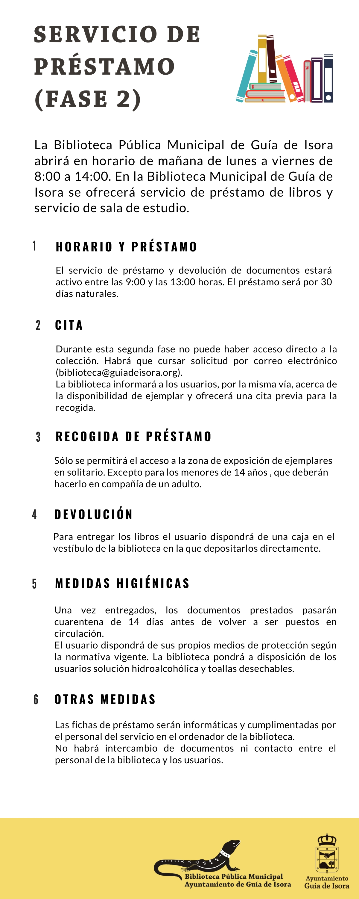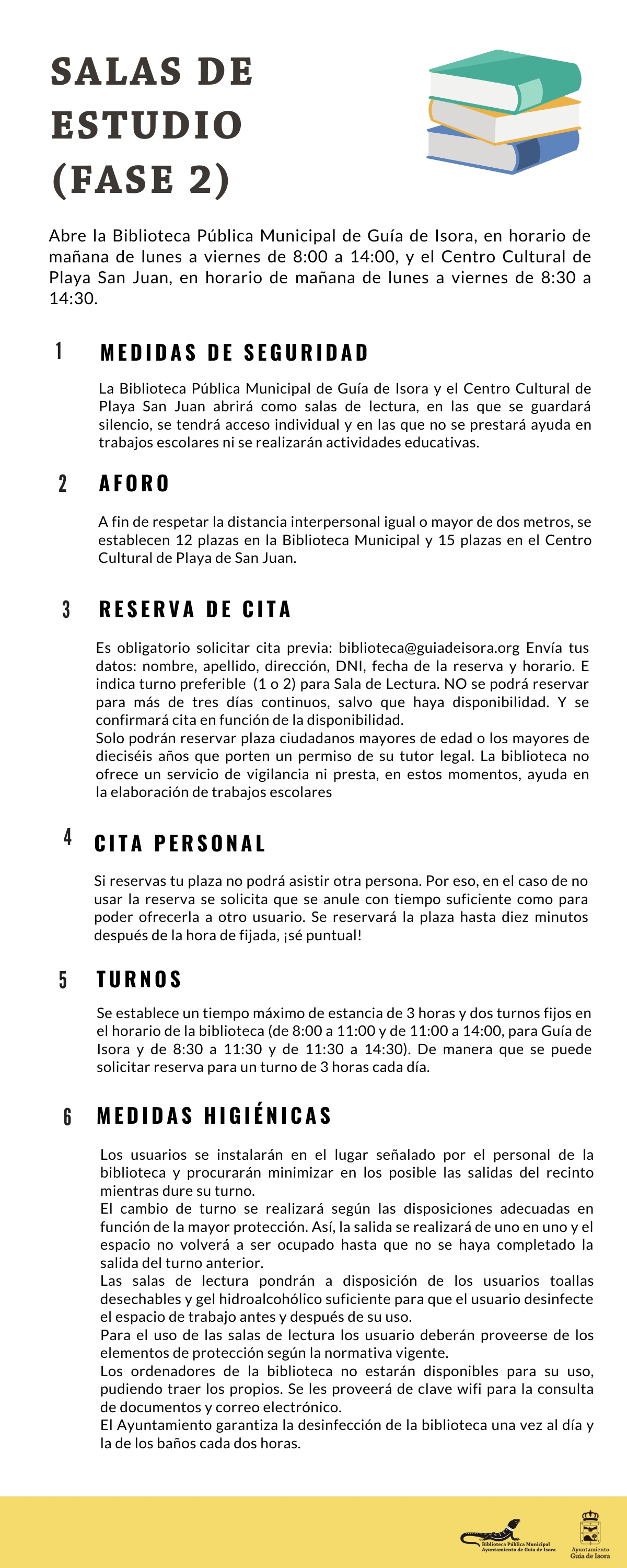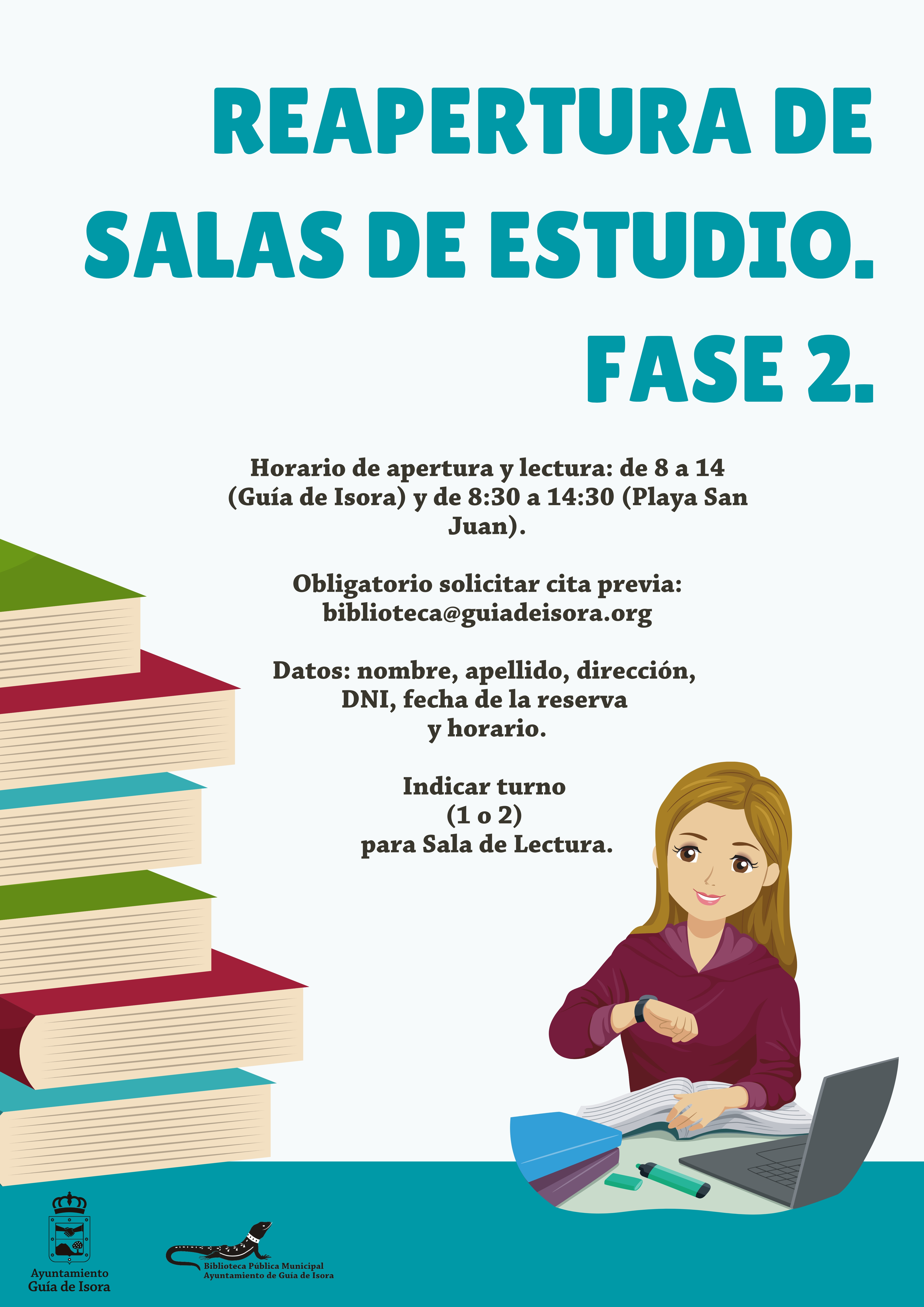 Las salas de estudio ubicadas en la Bibilioteca Municipal de Guía casco y en el Centro Cultural de Playa San Juan reabren sus puertas en horario de 8:00 a 14:00 y de 8:30 a 14:30 respectivamente, mediante cita previa que debe solicitarse por correo electrónico (biblioteca@guiadeisora.org)