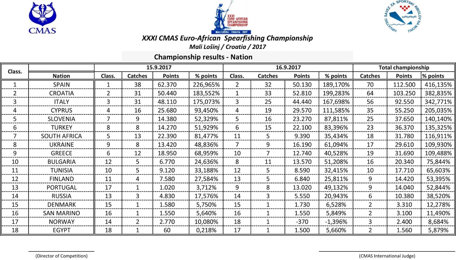 Tras el pesaje de las capturas del segundo día de competición en la 31 edición de este campeonato, la selección española se proclamó campeona, seguida de Croacia e Italia.