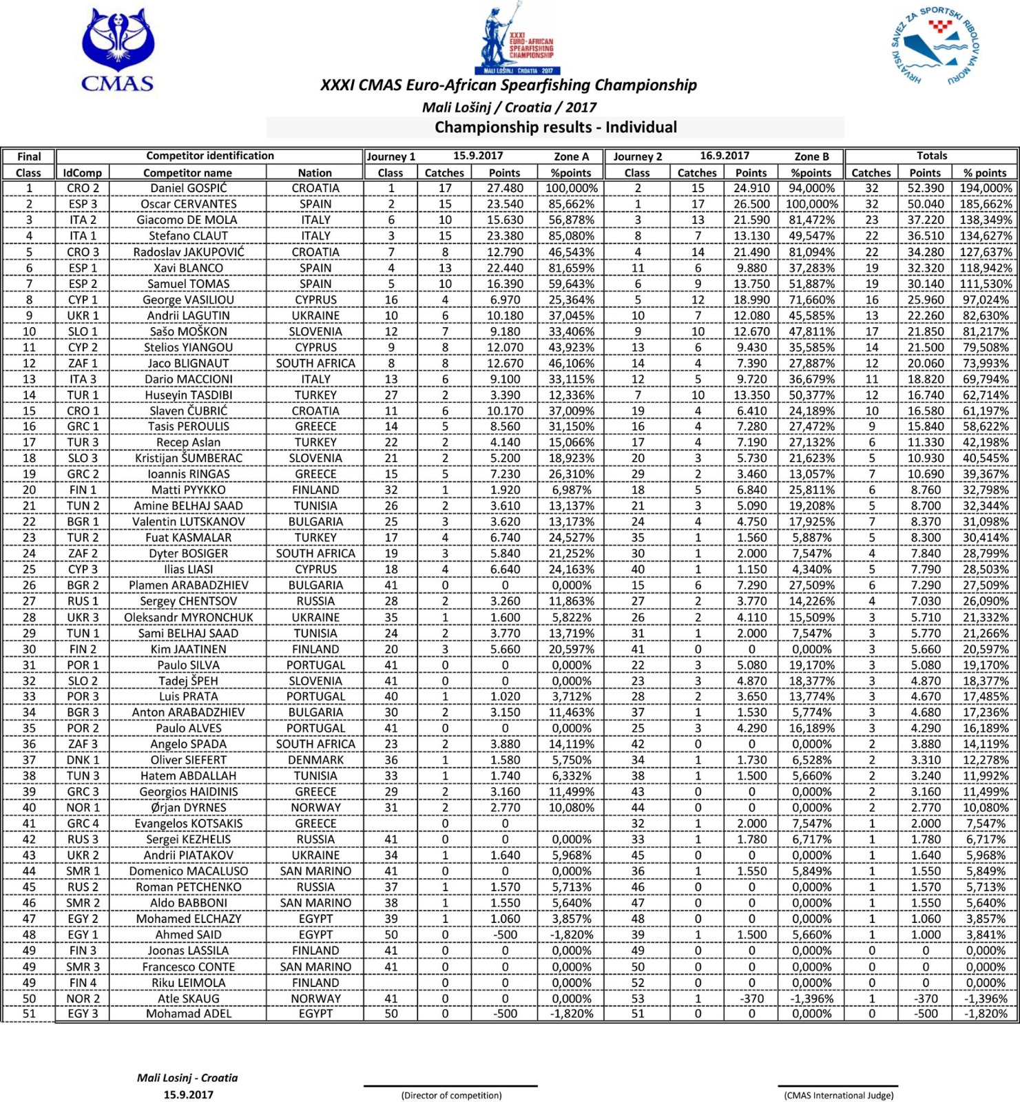 De forma individual, los 3 pescadores titulares de España quedaron en las siguientes posiciones: Óscar Cervantes (segundo con un total de 50.040 puntos); Xavi Blanco (sexto, con un total de 32.320 puntos); y Samuel Tomás (séptimo con un total de 30.140 puntos).